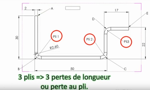 Pour une pièce de tôlerie possédant plusieurs valeurs de pliage, la méthode des cotes extérieures est utilisée. En effet, après avoir validé certains paramètres, il suffit d'additionner toutes les cotes "en extérieur" des plis puis additionner la somme de "pertes aux plis" pour avoir la longueur développée.