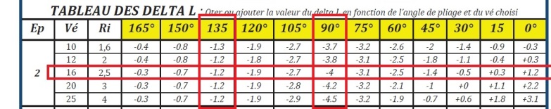 Une fois l'épaisseur et le Vé choisi, on pourra ainsi déterminer la "Perte au pli" pour chacun des angles de pliage de la pièce.