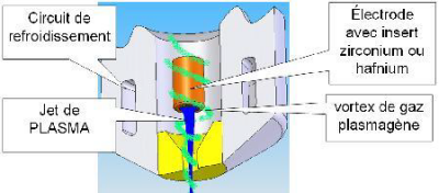 Elles sont équipées d'une électrode comportant un insert en zirconium (métal très émissif) qui stabilise le point de départ de l'arc. Elles utilisent l'air comme gaz. L'électrode et l'utilisation d'un vortex visent à placer le point d'émission de l'arc en dehors du courant gazeux et à éviter son oxydation.